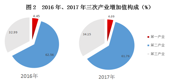 2017年,面对复杂的宏观经济形势,全区上下在区委、区政府的正确领导下,以习近平新时代中国特色社会主义思想为指导,围绕建设“家敦民富、大气精美”的现代化临淄这一奋斗目标,积极推进供给侧结构性改革,全年经济稳中有进,社会事业全面进步,新旧动能转换取得新进展,转型升级越上新台阶。 一、综 合 初步核算,全区实现生产总值(GDP)938.8亿元,按可比价格计算,比上年增长6.5%。其中,第一产业增加值38.4亿元,增长4.7%;第二产业增加值579.8亿元,增长5.8%;第三产业增加值320.6亿元,增长8.1%。产业结构更趋优化,三次产业比由上年的4.45:62.56:32.99调整为4.09:61.76:34.15。第三产业占GDP的比重较上年提高1.16个百分点,对经济增长的贡献率为39.4%,较上年提高7.1个百分点。 全年城镇新增就业13690人,比上年增加1800人。失业人员再就业达到9314人,比上年增加2032人,其中困难群体再就业850人。年末城镇登记失业率2.34%,低于全区3%的控制目标。新增省级“四型就业社区”3个,市级“四型就业社区”8个,人社公共基础信息数据库,自然人信息库完成信息采集录入49.3万人,法人单位信息库采集录入信息2394家。 全区500万元以上外来投资项目85个,比上年增加24个;实际到位资金136.3亿元,比上年增长36.0%。重点领域招商力度加大。战略性新兴产业外来投资项目40 个,比上年增加6 个,实际到位资金15.7 亿元,比上年增长14.6%;服务业招商引资项目20个,比上年增加13 个,实际到位资金27.3亿元,比上年增长133 .0%;股权招商及上市融资项目 8个,实际到位资金51.9亿元。大项目实现较快增长。过亿元的招商引资项目 67个,比上年增加18 个,实际到位外来投资121.9亿元,比上年增长30.2%。斐讯ID大数据中心、颐高电子产业园 、鲁中现代综合物流产业园等一批重大产业招商项目落地。 二、动能转换与创新 高新产业产值占规模以上工业总产值比重达35.8%,较年初提高1.2个百分点。装备制造业产值比上年增长0.7%,占规上工业总产值的比重为5.8%,比上年提高0.2个百分点。以信息传输、软件业和信息技术服务业,科学研究和技术服务业等行业为代表的战略性新兴服务业营业收入达16.0亿元,比上年增长23.5%。 技术人员数量继续增长,初级、中级、副高级和正高级专技人员分别新增439人、209人、86人和2人;初级、高级和技师技能人员分别新增2100人、88人和2人;新增齐鲁首席技师1人,市首席技师2人,市有突出贡献技师1人。 年末拥有省级工程技术研究中心13家,市级工程技术研究中心41家,市级产业技术创新战略示范联盟10家,院士工作站10家。完成发明专利申请806件,授权143件,有效发明748件,万人拥有量超过11.5件,PCT国际申请41件。 三、农林牧渔业 全年实现农林牧渔业总产值64.4亿元,按不变价格计算,比上年增长4.9%。其中,农业产值50.6亿元,增长4.9%;林业产值0.4亿元,增长3.6%;牧业产值12.1亿元,增长2.8%;渔业产值105万元,增长3.1%。农林牧渔服务业产值1.5亿元,增长10.8%。全年粮食总产量38.5万吨。其中,夏粮产量17.4万吨,比上年下降1.1%;秋粮产量21.1万吨,比上年下降1.7%。蔬菜、水果产量分别为92.6万吨和1.2万吨;肉类、奶类、禽蛋产量分别达5.1万吨、1.3万吨和0.9万吨。 以思远为代表的农业服务业企业推出3.0版农保姆管理系统,汇聚20余种果蔬的标准化服务大数据,包括1000余部相关教学片,296门标准化种植学习课程等。实现山东、山西、陕西、内蒙等12个省市区的91个加盟分社和2532个村级服务站的互联互通,为全国61300余名标准化社员提供移动化、精准化的标准化种植全流程服务。农保姆管理系统有效降低了农药、化肥投入量,提高了农作物产量,成为农业部农业农村大数据实践案例。 四、工业和建筑业 全年规模以上工业增加值比上年增长5.4%;工业总产值比上年增长7.8%;主营业务收入比上年增长3.7%;利润比上年下降10.0%;利税比上年下降3.2%。 年末有资质的建筑企业98家,全年实现建筑业总产值 107.3亿元,比上年增长8.0%。其中,建筑工程产值76.1亿元,比上年增长4.7%;安装工程产值28.4亿元,比上年增长21.9%。本年新签合同额为115.7亿元,比上年增长21.9%。房屋建筑施工面积84.3万平方米,比上年增长67.3%。 五、固定资产投资 全年完成固定资产投资470.5亿元,比上年增长1.7%。从产业划分看,第一产业投资4.4亿元,比上年下降33.1%;第二产业投资236.5亿元,比上年下降32.2%;第三产业投资229.6亿元,比上年增长113.9%。 全年完成房地产开发投资27.3亿元,比上年增长38.5%。商品房销售面积94.1万平方米,比上年增长47.1%。商品房销售额58.3亿元,比上年增长51.8%。 六、内外贸易 全年实现社会消费品零售总额294.8亿元,比上年增长10.0%。限额以上贸易业平稳增长,其中批发业实现销售额209.2亿元,比上年增长25.5%;零售业实现销售额44.5亿元,比上年增长11.2%;住宿业实现营业额1.1亿元,比上年增长14.8%;餐饮业实现营业额8.3亿元,比上年增长11.1%。 全年实现进出口总额141.9亿元,比上年增长74.6%。其中,进口额102.7亿元,比上年增长132.7%;出口额39.2亿元,比上年增长5.6%。全区实际利用外资5.7亿元,比上年增长27.4%。 七、交通、邮电和旅游 全年公路客运量(公交客车运输) 3002万人,比上年增长1.0%;公路客运周转量(公交客车运输)61100万人公里,比上年增长1.0%;公路货运量10295万吨, 比上年增长2.0%,公路货运周转量126.1亿吨公里, 比上年增长6.0%。年末公路通车里程达到621.2公里。 全年邮电