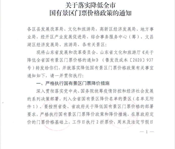 降低国有景区门票价格是深入贯彻落实党中央、国务院统筹疫情防控和支持经济发展,加快促进旅游业复苏,拉动居民旅游消费的有力措施。我区列入降低国有景区门票价的景区有3家(名单见附件1),各景点要严格执行省委、省政府降低国有景区门票价格的部署要求,严格执行降价政策和降价措施,在原政府定价的基础上工作日执行2折优惠票价,周末及法定节假日执行5折票价的优惠政策。