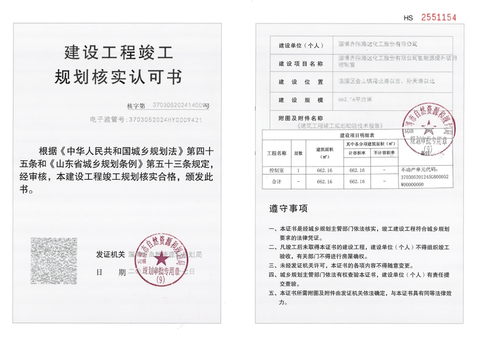 淄博齐翔腾达化工股份有限公司氢能源提升项目竣工信息