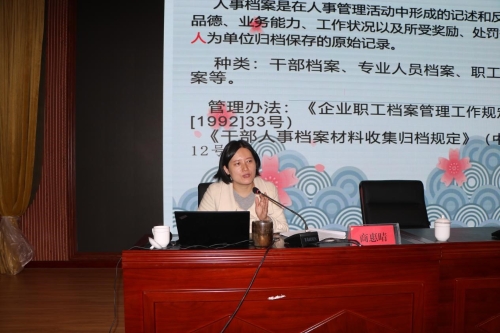 会上,档案馆商惠晴科长对人事档案审核认定把握的原则、认定依据、材料甄别、审核档案注意事项等方面进行了详细讲解,列举事例进行充分说明,并根据区委组织部对党员档案规范化整理要求,指导我系统党员档案的整理。