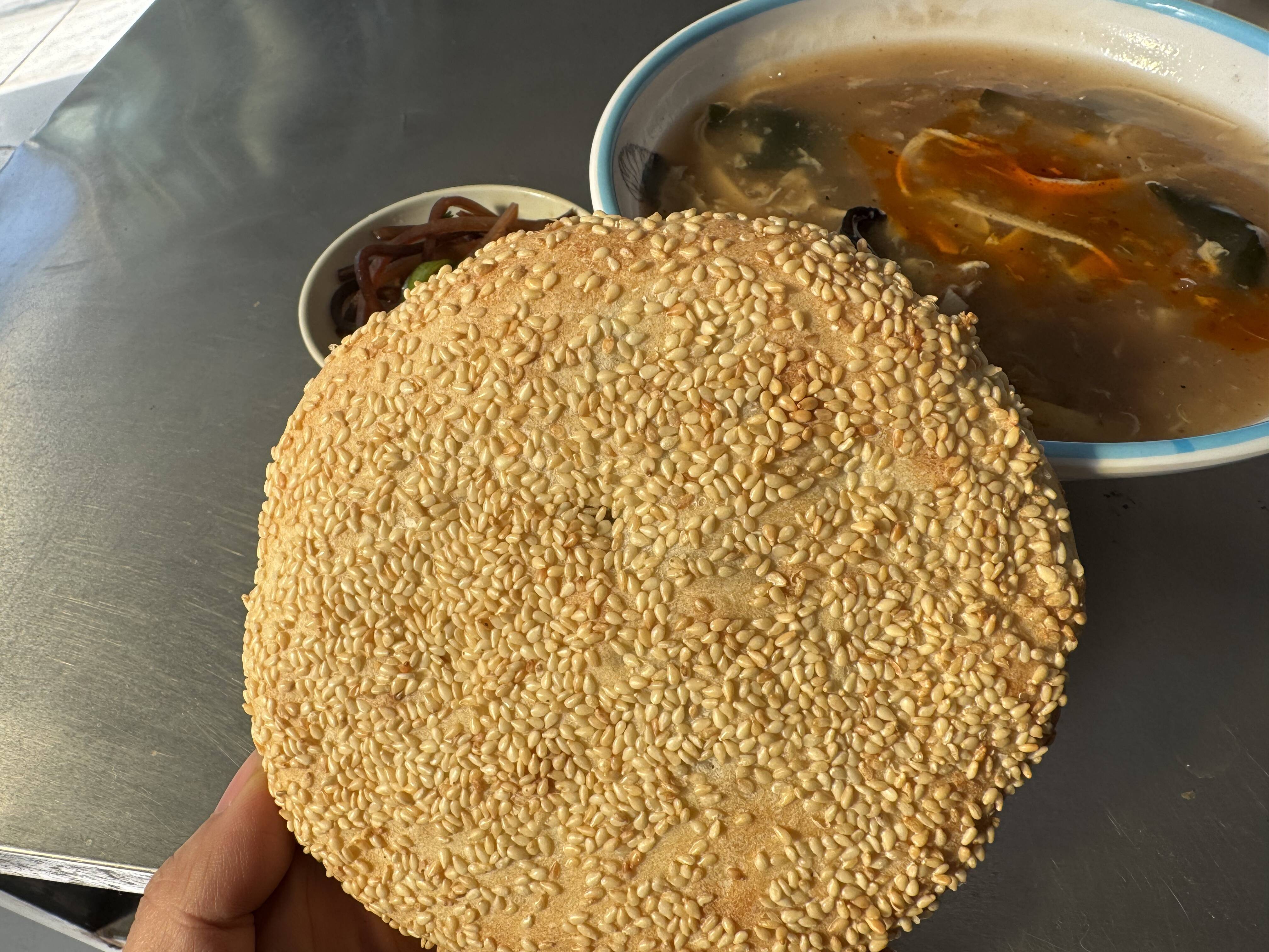 时移事易,随着电烤炉的生产,镇上有几家烧饼铺的土制烤炉换成了电烤炉,好处“产品”数量上去了,但脱离了老手艺,烤出的烧饼热着吃还不错,可是凉了以后吃,烧饼的酥脆感没了。老早听说在“鼎辉食品”西侧有一家“金岭厚泉烧饼”,生意很火,被评为“临淄十大名吃”。于是,我有意前往“考察”一番。
