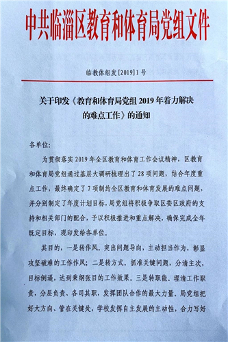 2019年4月1日,临淄区教育和体育局党组印发《教育和体育局党组2019年着力解决的难点工作》的通知,明确年内区教体局党组着力要解决的7件难点工作,引领全区上下写好教体发展的“奋进之笔”。经过不懈努力,临淄区齐陵中心小学改建竣工投用,临淄区九村居中学启动建设,临淄区淄江第二幼儿园等3所小区配套幼儿园、临淄区皇城镇3所幼儿园主体完工,农村中小学幼儿园厕所完成改造任务,小学生课后服务工作配套政策出台,农村幼儿教师“五险一金”实现全覆盖,62名农村公办幼儿教师全部上岗。临淄区教体局党组被评为淄博市“担当作为、狠抓落实”先进集体。