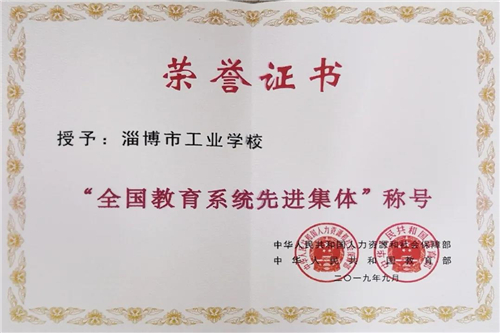 2019年9月9日,人力资源社会保障部和教育部联合发布《关于表彰全国教育系统先进集体和全国模范教师全国教育系统先进工作者的决定》,淄博市工业学校荣获“全国教育系统先进集体”荣誉称号,这是该校第二次获此殊荣。2019年,淄博市工业学校积极适应新时代职业教育改革发展要求,持续推进学校改扩建工程,构建递进式教师培养机制,进一步完善教学管理体系,全国职业院校技能大赛“网络空间安全”赛项实现“两连冠”,春季高考本科录取人数连续10年稳居全市第一,顺利通过了山东省示范性中等职业学校市级复评。